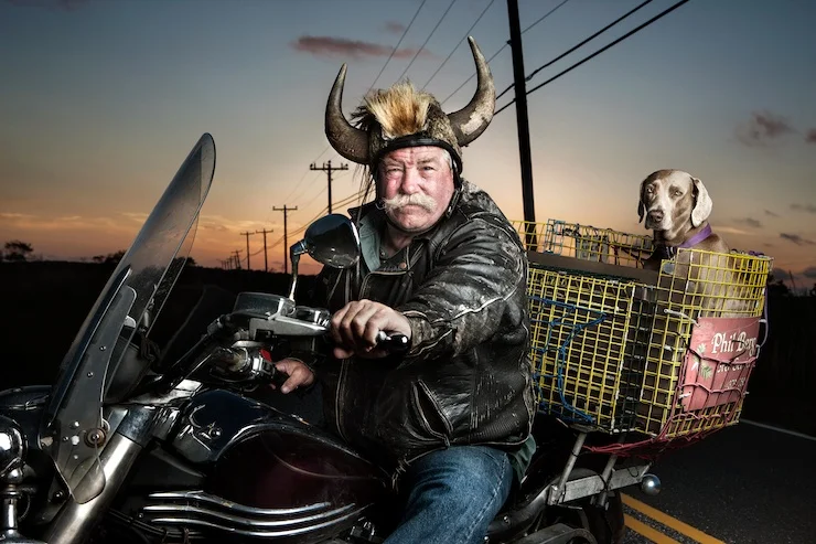This portrait was set up in the middle of a quiet road on the outskirts of town. We had a huge strobe lighting him, taking up an entire lane. Every few minutes, someone would slowly drive by this spectacle and stop to say hello to Phil. It seems that there wasn’t anyone in town who didn’t know him. The fifth or sixth friend to stop by was driving a monster truck with enormous tires. The driver began chatting with Phil for a few minutes until he was interrupted by his girlfriend, whose head popped up from somewhere below the steering wheel. She cheerfully introduced herself before disappearing again and we continued shooting till the sun went down.