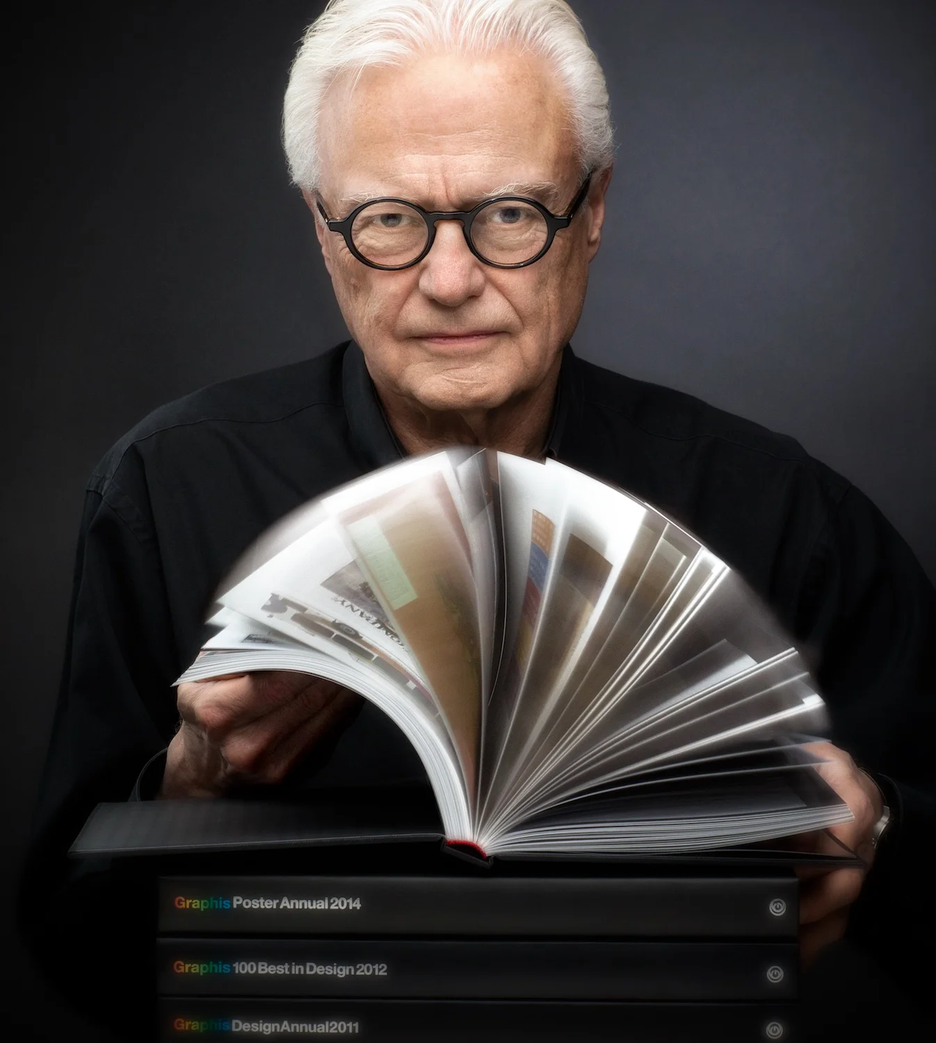 It’s never easy to distill the accomplishments of a creative icon into one portrait. Graphis is one of the most respected showcases for the world’s best graphic designers, art directors, photographers, illustrators, and architects. Using the annuals as the primary visual element in Pedersen’s photo was an easy decision for me.